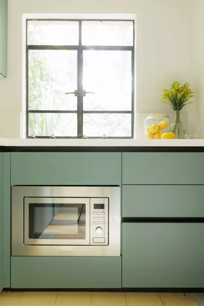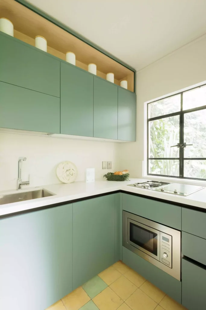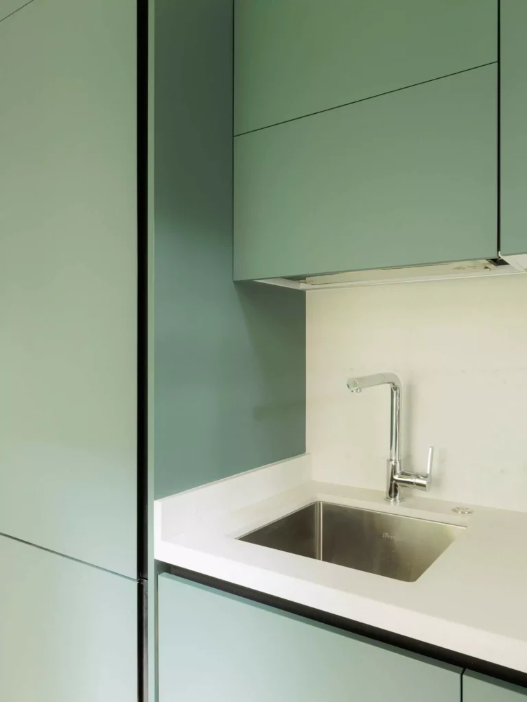 En lo que alguna vez fue el cuarto de servicio, Vitelier ha diseñado una cocina compacta pero completa. Con menos de cuatro metros cuadrados, esta cocina modular destaca por sus frentes de melamina antihuellas en un sofisticado verde olivo mate. La iluminación cálida provista por tiras LED crea un entorno acogedor y funcional, ideal para el día a día.