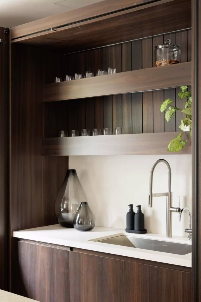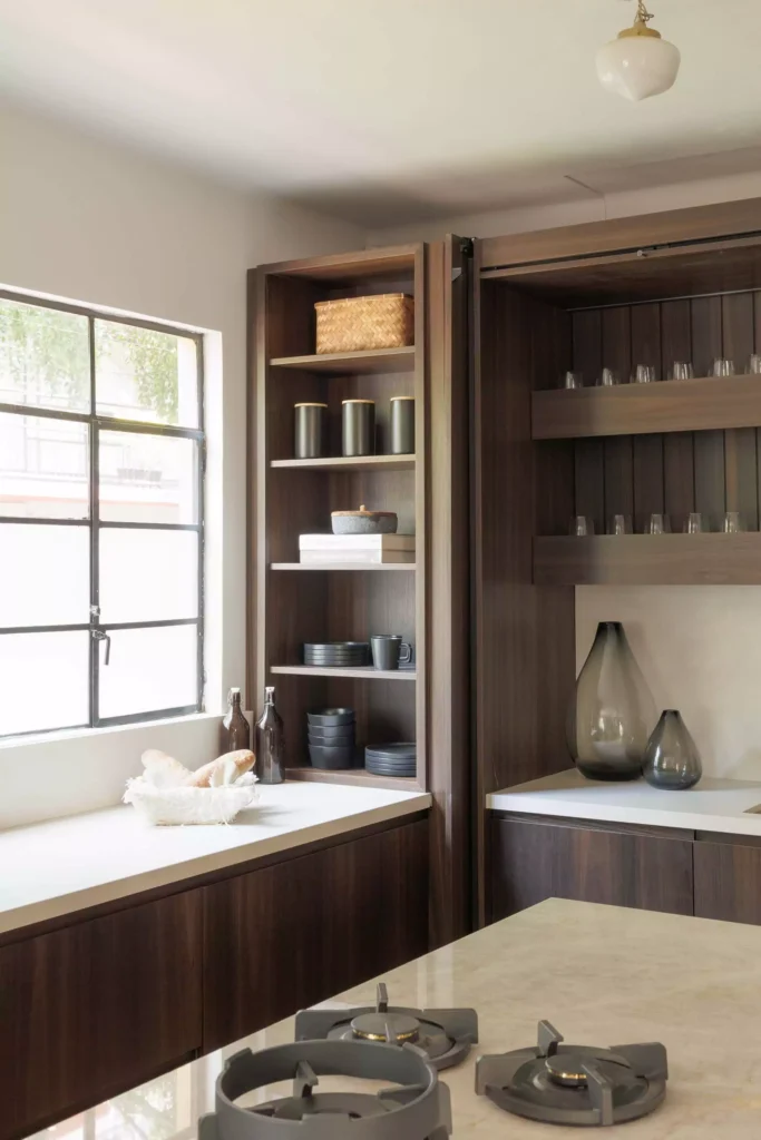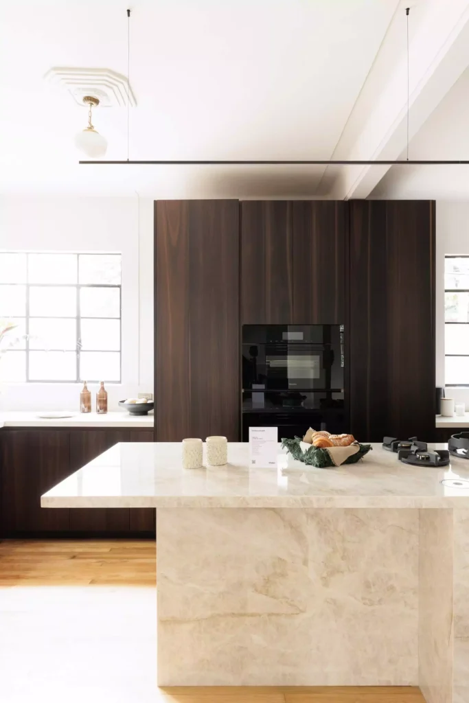 El recorrido fluye de manera natural hacia la cocina principal, un espacio que evoca calidez a través de la madera, pero que incorpora las tecnologías más avanzadas que distinguen a Vitelier. Con frentes revestidos en chapa de eucalipto ahumado, el diseño logra una textura natural y elegante.