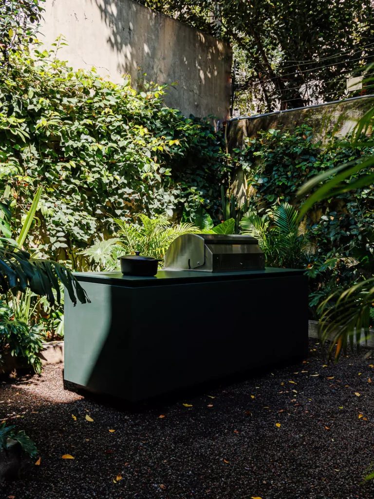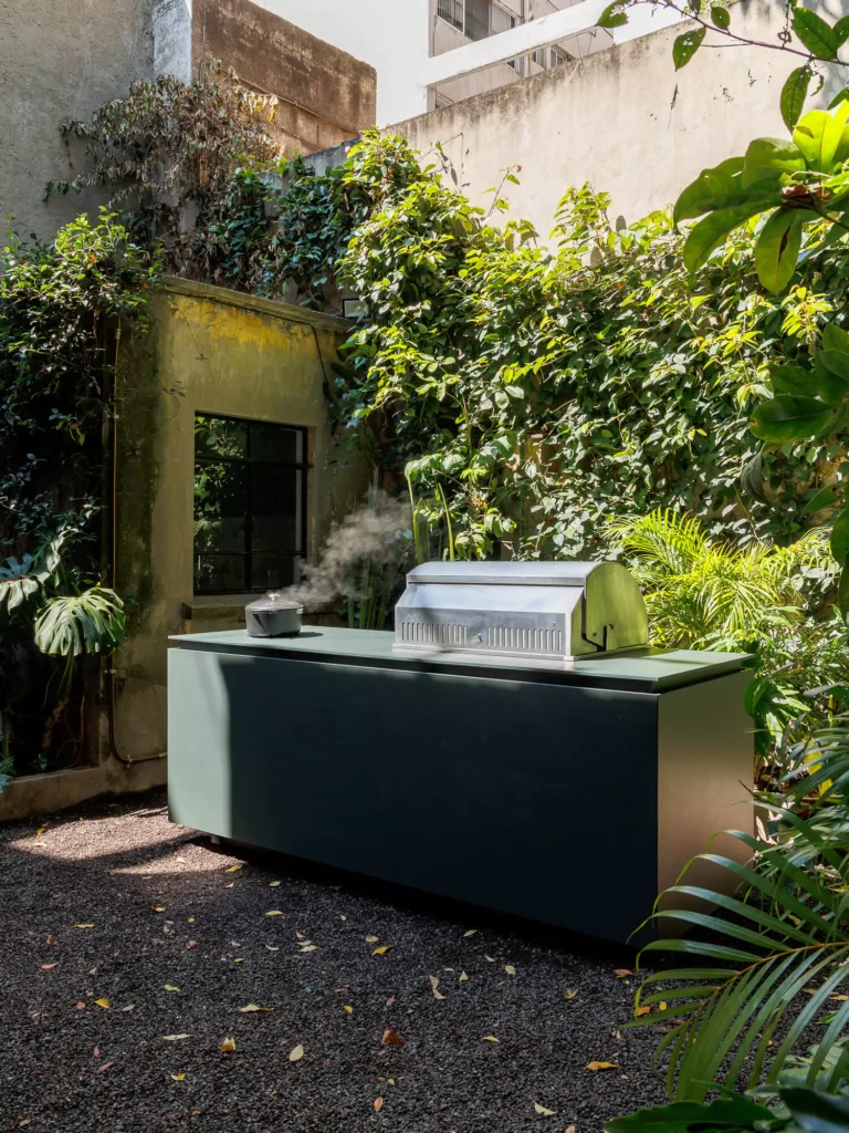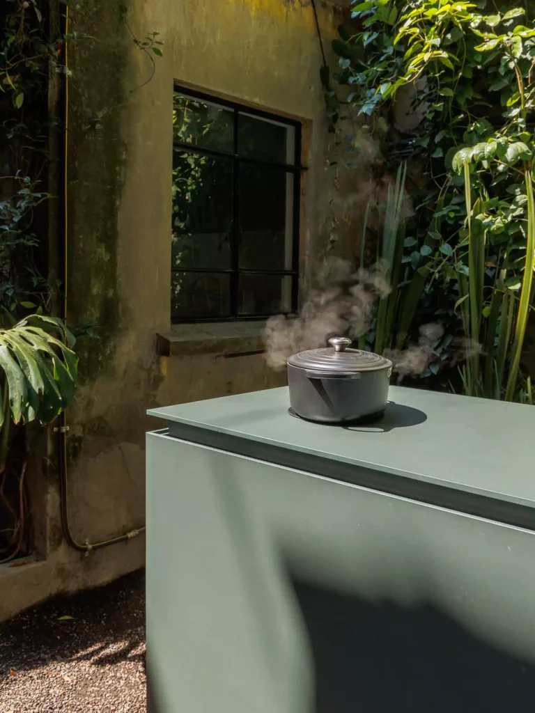 El equipo de cocción incluye un asador de carbón Blaze de acero inoxidable, robusto y versátil, junto con un sistema de cocción por inducción Invisacook, cuyos quemadores de porcelana permanecen ocultos bajo la cubierta para mantener una estética impecable. El uso de Dekton Feroe en la superficie de trabajo asegura resistencia a los rayos UV, manchas y altas temperaturas, garantizando que esta cocina exterior sea tan utilitaria como bella.